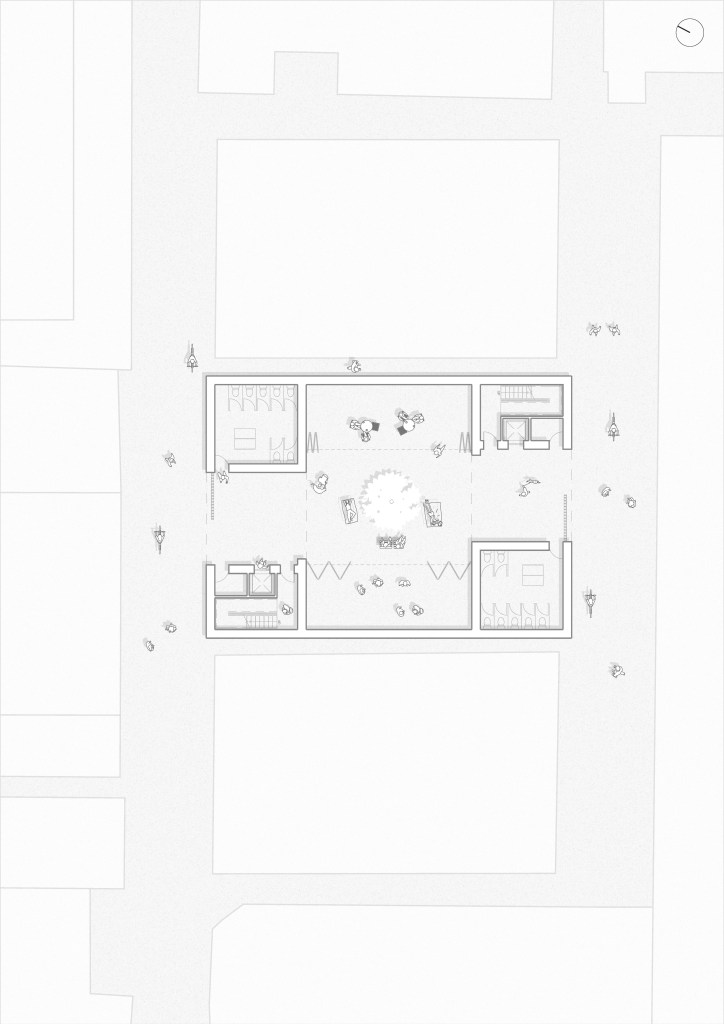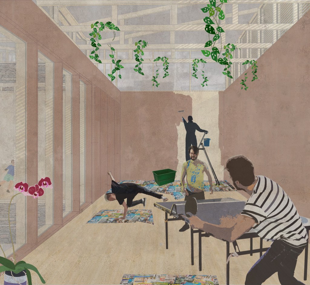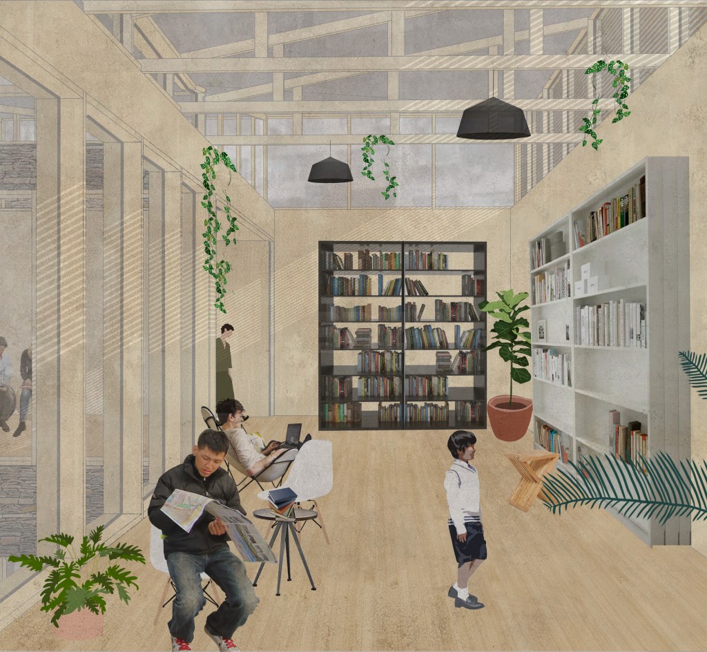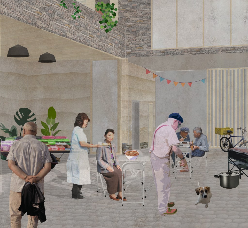 Community Centre 01 explores the concept of “private claims on public space” in the urban villages of Hankou, Wuhan, where residents creatively adapt narrow alleyways into gardens, storage, or outdoor living areas. This fourth-year project marked a shift into a completely new context, designing within a super-dense Chinese city, requiring careful cultural and spatial sensitivity. In response, the proposal introduces a network of compact (300m²), adaptable community centres integrated into tight urban fabrics. These centres offer flexible indoor/outdoor rooms that residents can use as they wish, reflecting existing informal practices. The design promotes community-led construction through local workshops that share traditional methods and material knowledge. By using locally sourced materials such as rammed earth, recycled bricks, and tiles, the project maintains cultural identity while encouraging sustainable practices. Scattered throughout Hankou, the centres aim to strengthen social cohesion, offering accessible, shared spaces that respond to the urban village condition and empower residents to shape their environment.