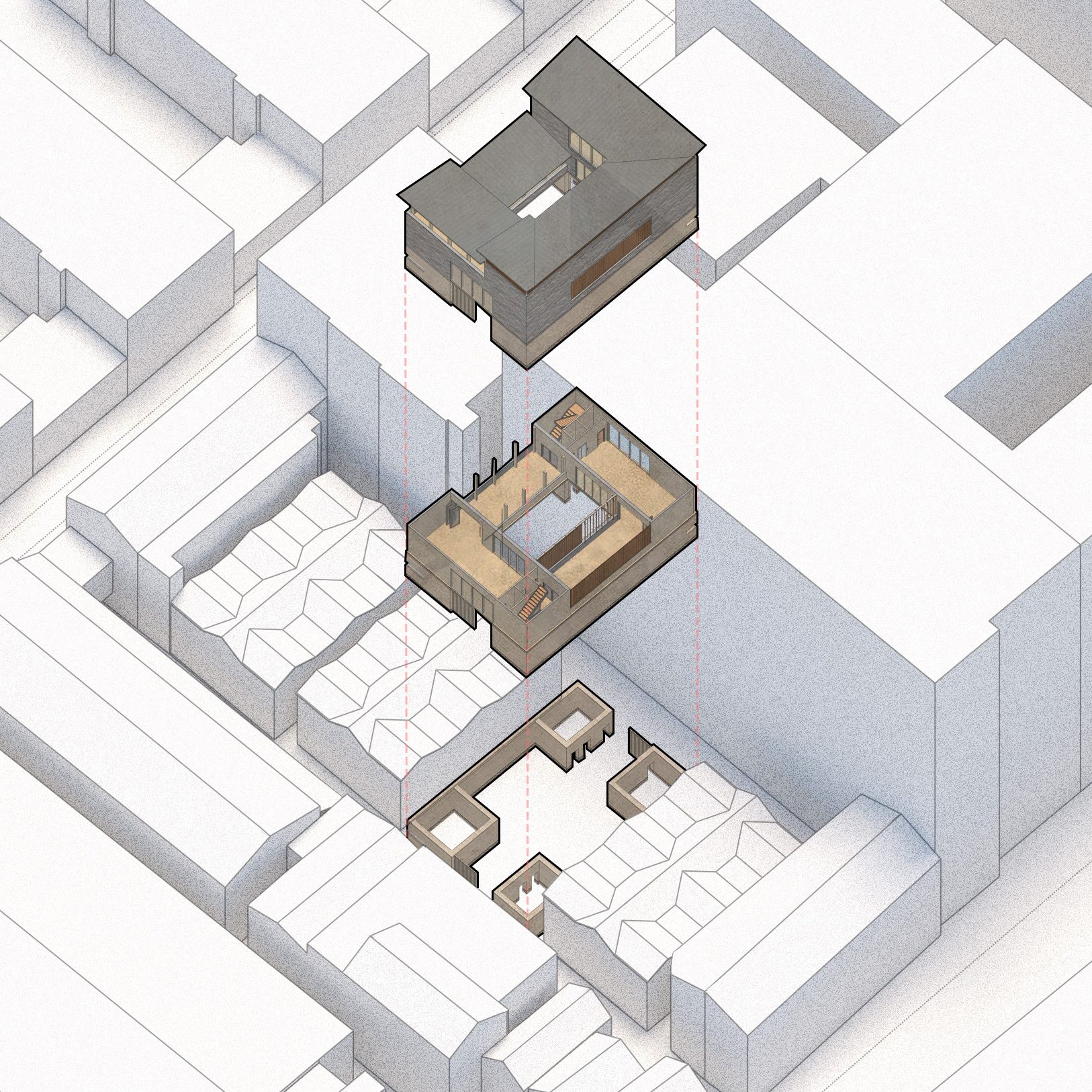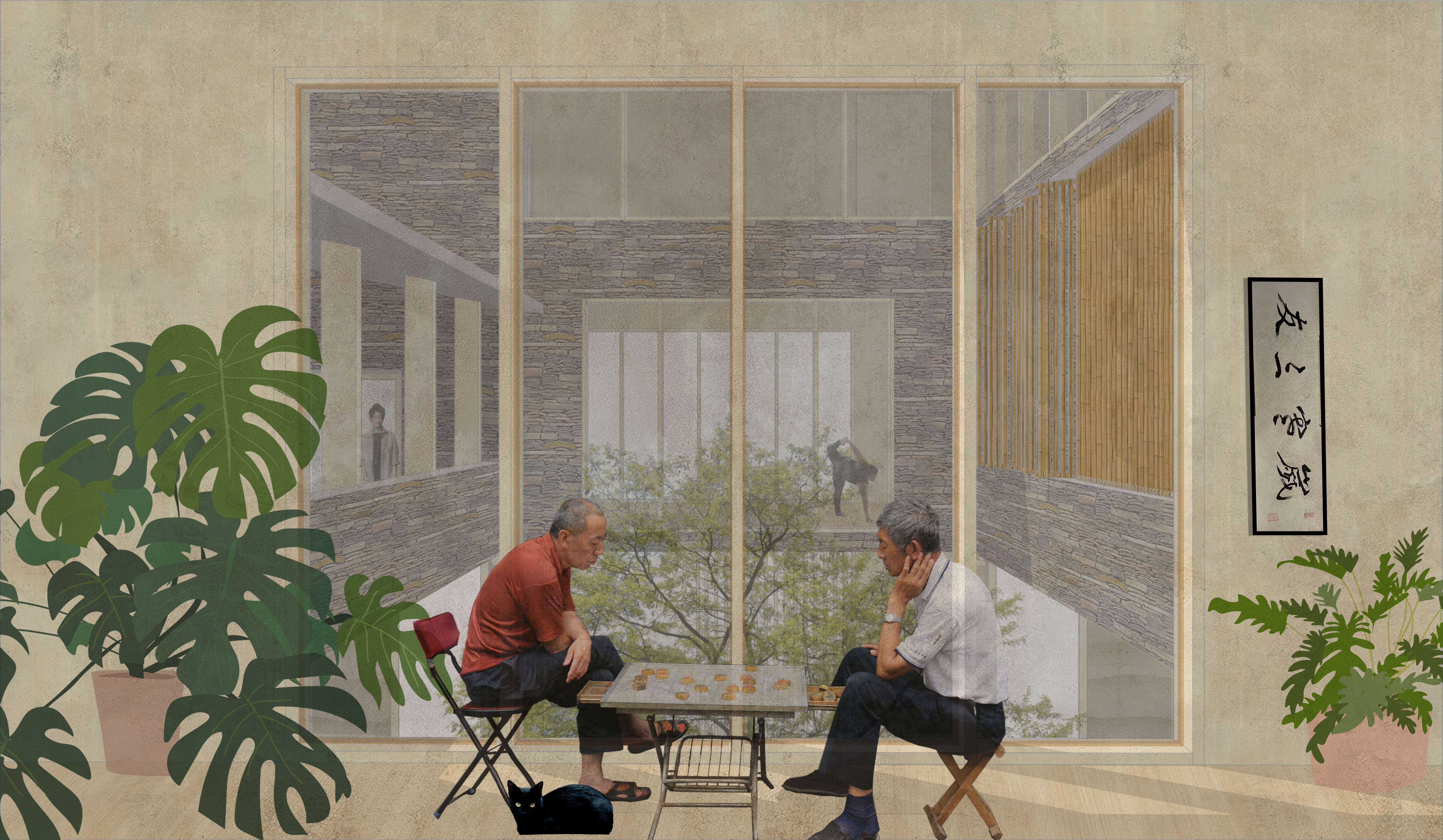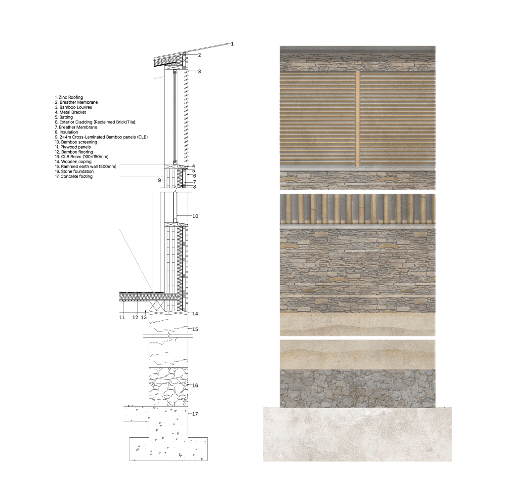 Community Centre 01 explores the concept of “private claims on public space” in the urban villages of Hankou, Wuhan, where residents creatively adapt narrow alleyways into gardens, storage, or outdoor living areas. This fourth-year project marked a shift into a completely new context, designing within a super-dense Chinese city, requiring careful cultural and spatial sensitivity. In response, the proposal introduces a network of compact (300m²), adaptable community centres integrated into tight urban fabrics. These centres offer flexible indoor/outdoor rooms that residents can use as they wish, reflecting existing informal practices. The design promotes community-led construction through local workshops that share traditional methods and material knowledge. By using locally sourced materials such as rammed earth, recycled bricks, and tiles, the project maintains cultural identity while encouraging sustainable practices. Scattered throughout Hankou, the centres aim to strengthen social cohesion, offering accessible, shared spaces that respond to the urban village condition and empower residents to shape their environment.
