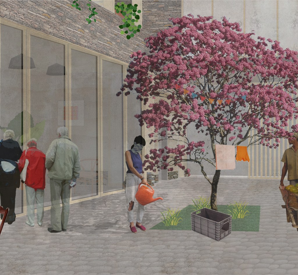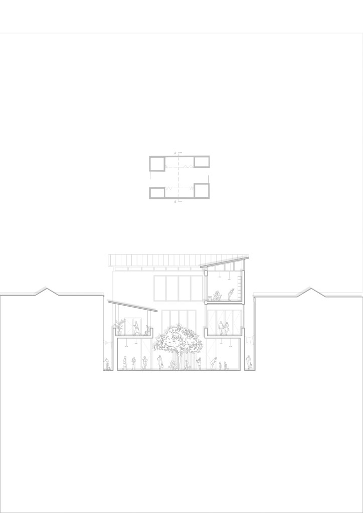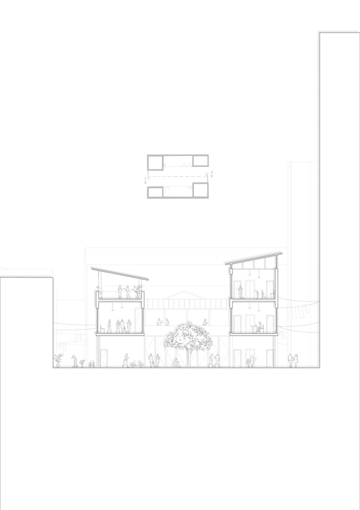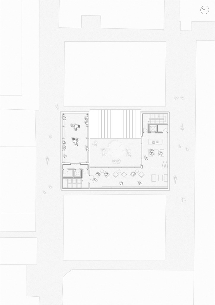 The courtyard presents an opportunity to expand upon ‘private claims on public space’. Introducing an open area which acts as a commmon space, which the residents can fully utilise however they wish, giving endless possibilites for personalisation. The flexibility of the bi-folds allows to bring in more people and opportunities to host larger social gatherings, while when the doors are closed, the courtyard then becomes a quieter, more intimate space. In the end its the community which decides on what this space becomes, giving them a sense of ownership.