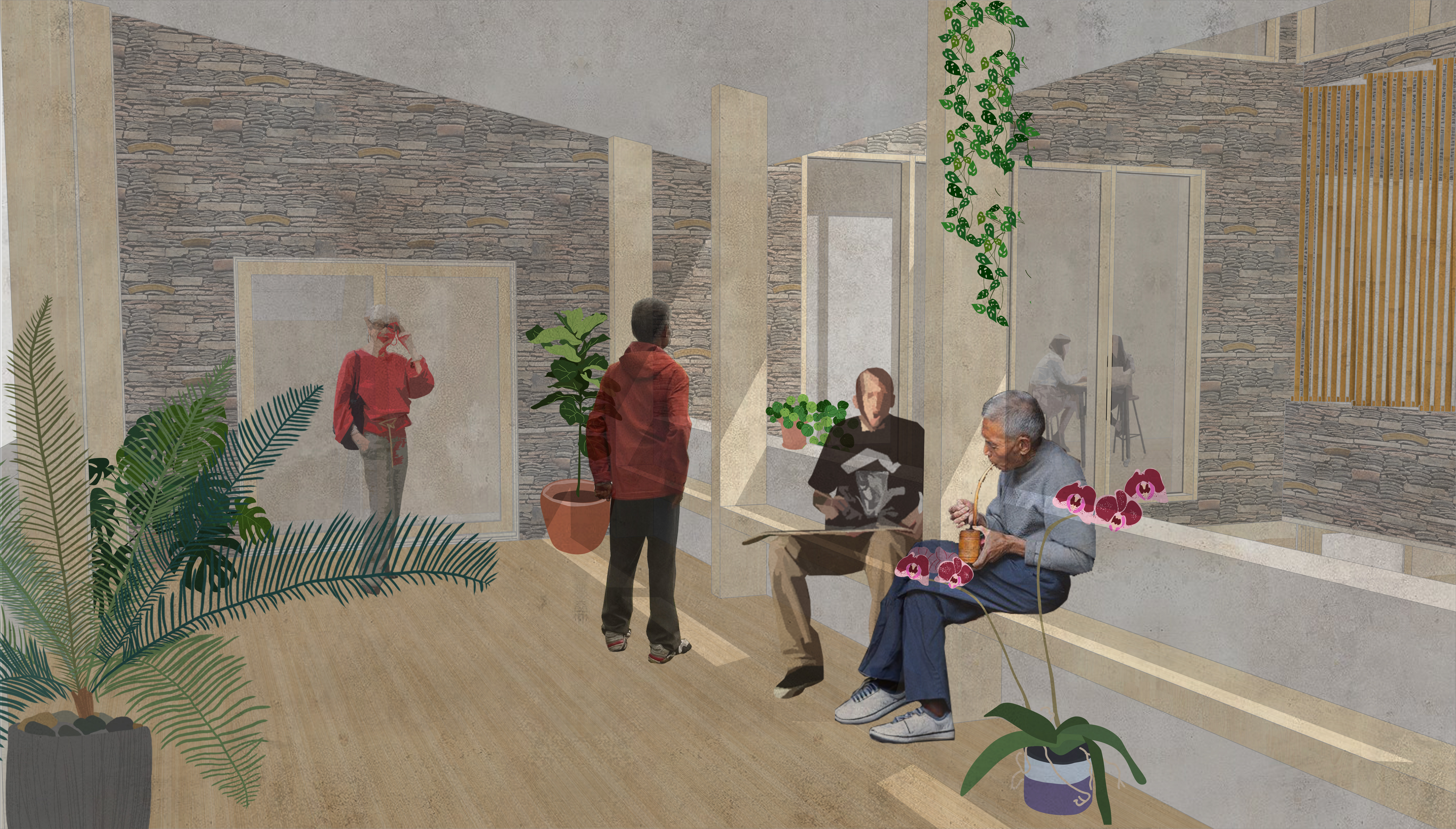 The key concept is to push forward the idea of the community centre being truly owned by the residents. The indoor spaces can be renovated, re-decorated and re-purposed. A room can go from a space for recreation or excercise, to a library/study area. Another time it can be a space for kids to hang out after school. The list is endless, and with multiple areas for storage found next to every stairwell, ther is opportunity to clear/fill the space at any given moment, when it is required.