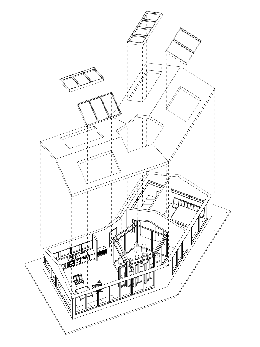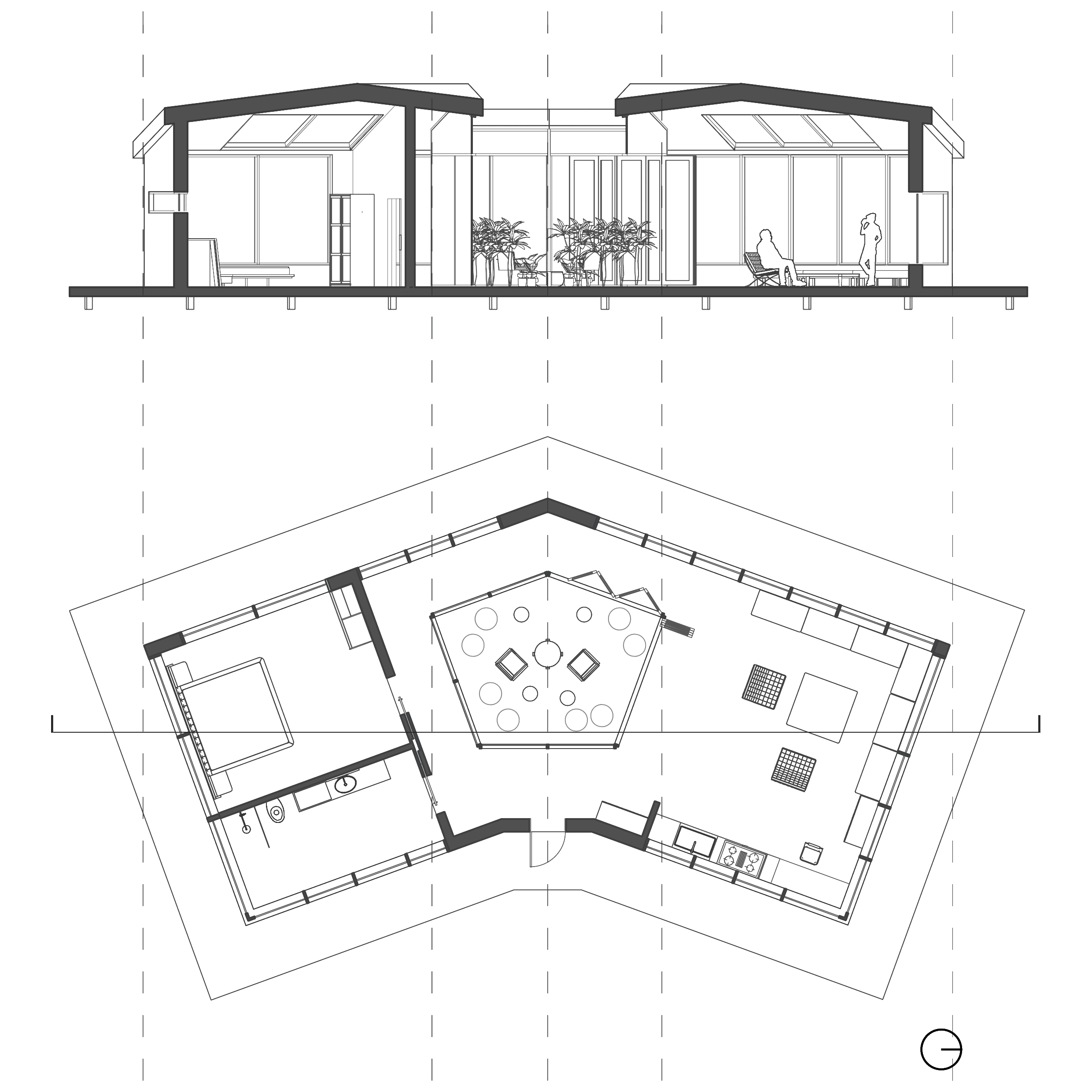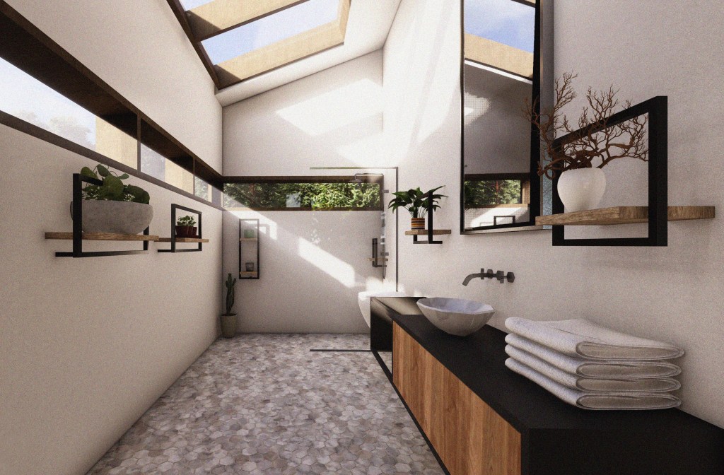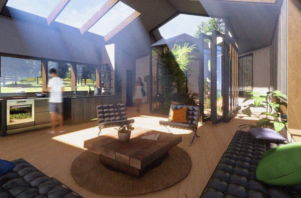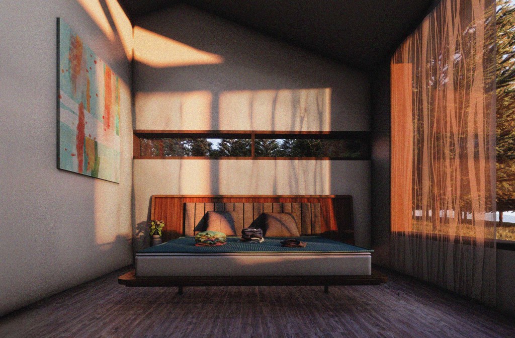Created for Buildner’s “Home of Shadows” competition, this design embraces the absence of artificial light by maximising the use of natural daylight. Expansive windows wrap the open-plan living and kitchen area, allowing sunlight to flood the space throughout the day. Roman blinds on each window give the occupants full control over the lighting, enabling them to adapt the ambiance to suit their needs.